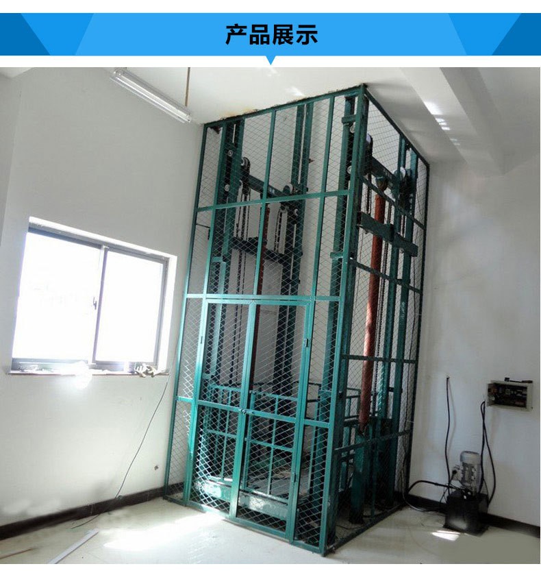 导轨式升降货梯是用于货物升降的液压升降机械设备,采用液压油缸作为主要动力,通过重型链条和钢丝绳传动,保证机器运行的绝对安全。无需地坑和机房,特别适合于有地下室、仓库改造、新建货架等,具有安装维修方便、美观、安全、操作方便。具体根据现场的实际环境生产。